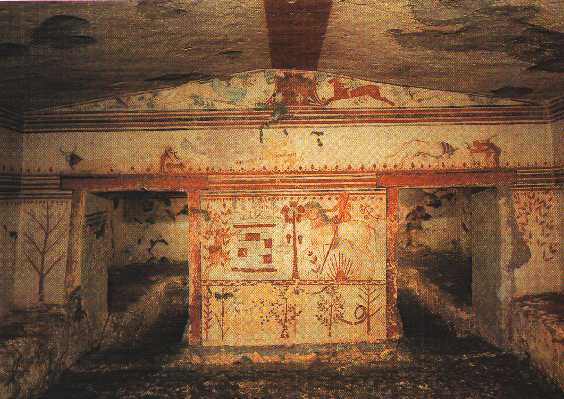 Im frühen 6. Jhdt. v,. Chr. entstehen dann die ersten bemalten Gräber. Ihr Wert ist nicht nur rein ästhetischer Art: die Wandgemälde machen uns nämlich nicht nur mit den Sitten und Gebräuchen der Etrusker bekannt, sondern sie verschaffen uns auch einen Einblick in die griechische Malerei, von der uns fast nichts erhalten blieb. Die Nekropolen von Monterozzi, südöstlich von Tarquinia gelegen, erstrecken sich über eine Fläche von fast 750 Hektar und bergen Tausende von Gräbern; die meisten von ihnen kann man allerdings nicht besichtigen. Es gibt ungefähr 150 bemalte Gräber in Tarquinia, von denen wir Kenntnis haben, aber nur 60 von ihnen sind mehr oder weniger gut erhalten; zu besichtigen sind bedeutend weniger. Die Gräber sind in ihren architektonischen Formen sehr einfach - im Gegensatz zu denen in Cerveteri. Meistens bestehen sie nur aus einer in den Tuff gehauenen Grabkammer, zu der oft ein unterirdischer Gang führte. Während die architektonischen Verzierungen in Cerveteri in den Tuff gemeisselt wurden, sind hier Pfeiler, Türen, Rahmen und Architrave ganz bunt in den lebhaftesten Farben gemalt. Natürlich sind die Wandmalereien von größtem Interesse; meistens sind sie auf einem dünnen Bewurf aus Putz ausgeführt; die Decke besteht aus zwei schrägen Flächen mit Mittelbalken - hier wurden die Farben direkt auf den Kalkfelsen aufgetragen. Die Unterteilung der Szenen erfolgte durch geritzte Linien, die Umrisse der Figuren, die mit Sicherheit ohne Vorlage entstanden, durch rote Linien, nur selten auch von einer geritzten Linie begleitet. Bei den älteren Fresken war die Farbskala ziemlich begrenzt, sie beschränkte sich auf Weiß (Kalkweiß oder Spanischweiß), auf Rot und Rosa (Eisenoxyd), hinzu kamen Grün, Blau, Ocker, sowie alle Farben, die aus einer Mischung der Zentralfarben enstanden.