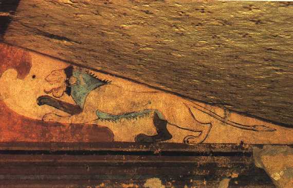 Beim Grab Tomba delle Pantere (= Panther), (580-570 v. Chr.) bleibt die Ausmalung auf die Giebel beschränkt; hier finden wir Tierdarstellungen, deren Körperumrisse durch rote Linien entstanden, ferner kleine rote Kreise mit einem Punkt in der Mitte - hier ist der korinthische Einfluß deutlich erkennbar.